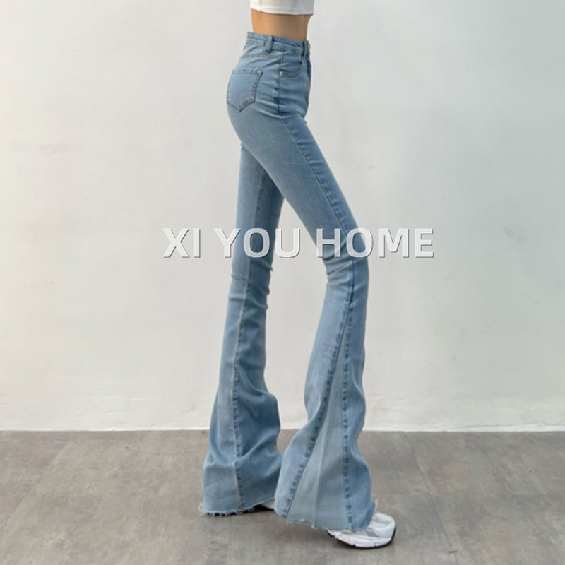 大长腿修身显瘦弹力微喇牛仔裤女高腰包臀拼接裤毛边喇叭裤拖地裤