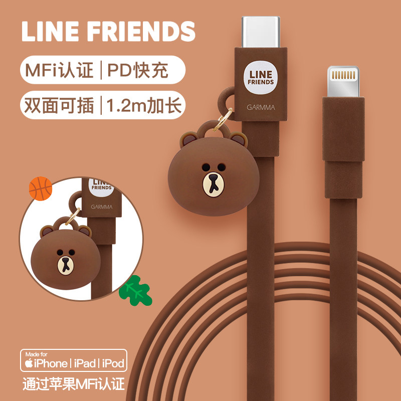 Line Friends布朗熊苹果数据线mfi认证pd快充typec充电线lightning线usb充电器线iPad平板iPhone14手机快充线