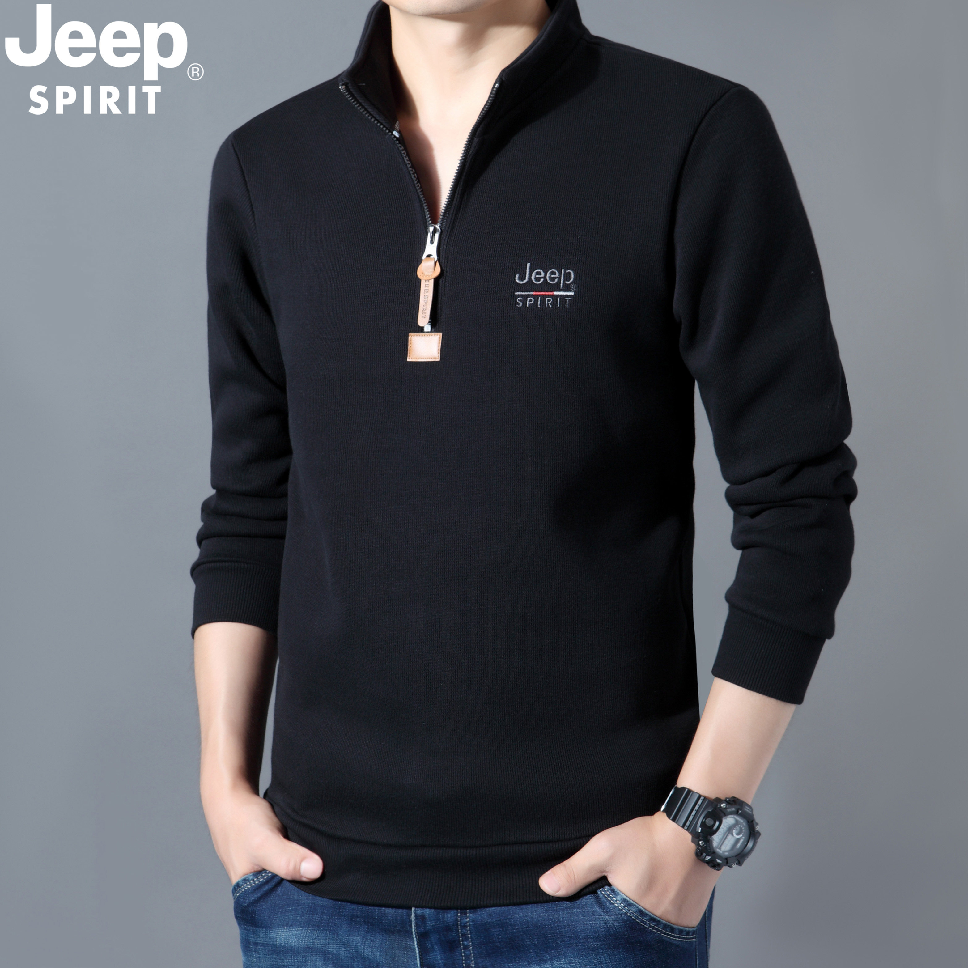 JEEP吉普加绒卫衣秋冬季男士纯棉立领套头保暖宽松大码休闲打底衫