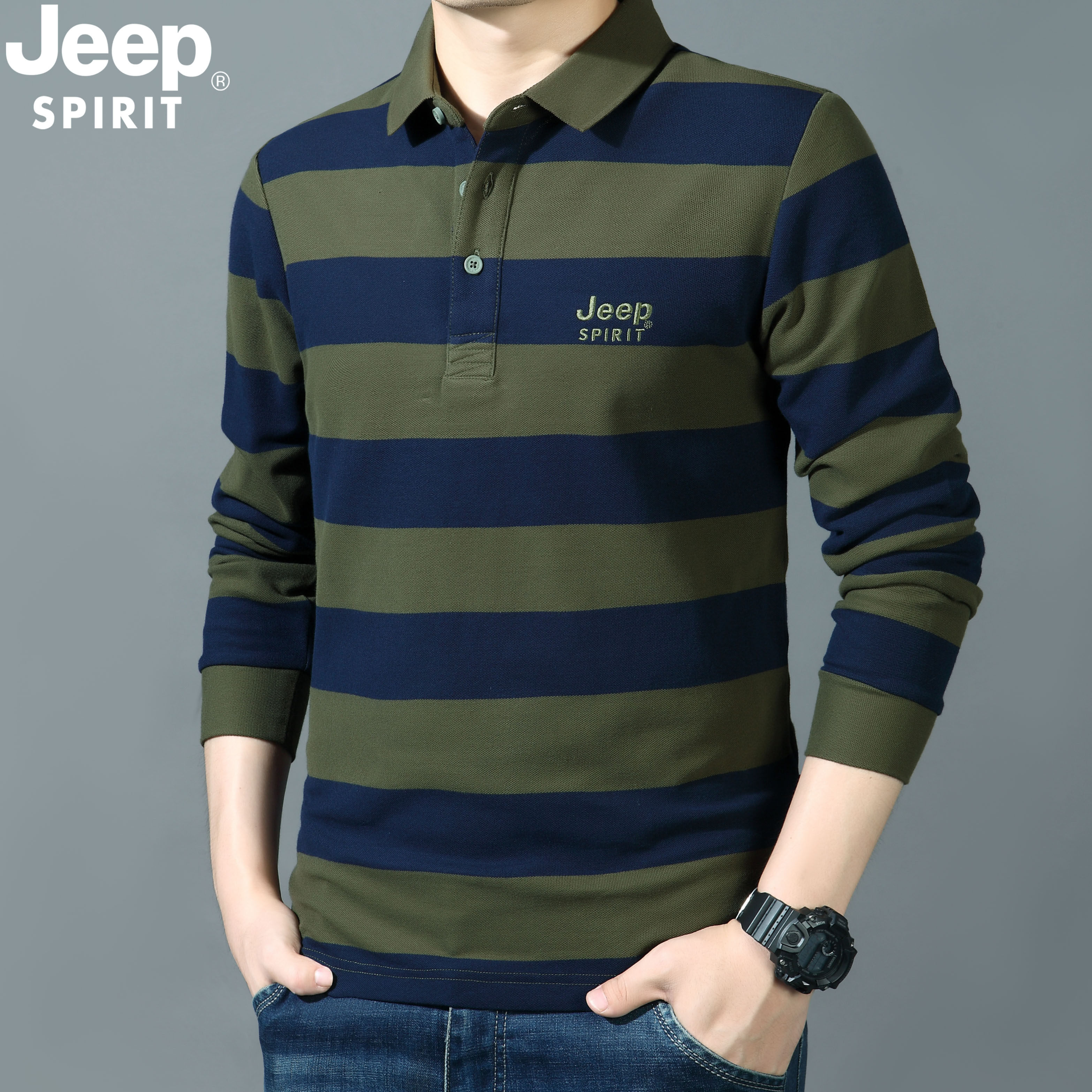 jeep长袖T恤秋冬季男士中年厚款纯棉翻领宽松大码条纹休闲polo衫