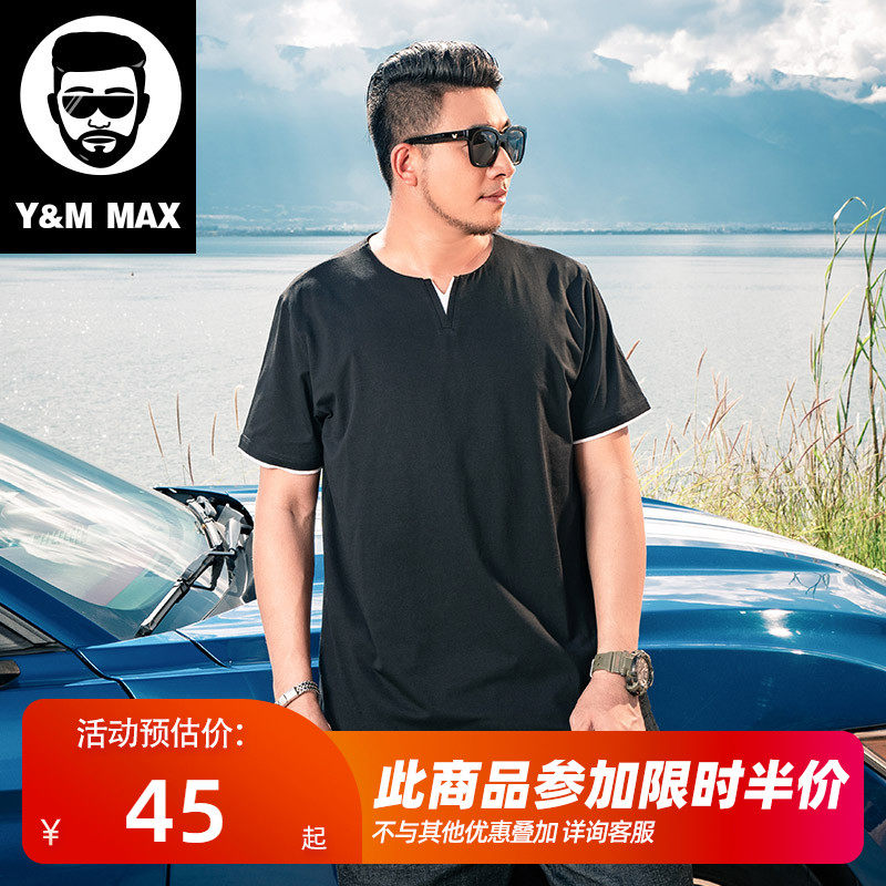大码男装潮牌半袖胖子宽松上衣加肥加大撞色v领短袖T恤200斤