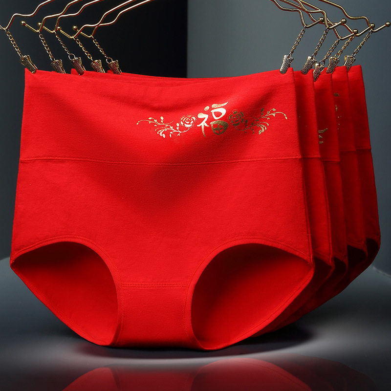 女士内裤四条装本命年大红色烫金印花生日内裤高腰内裤女收腹结婚
